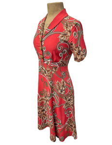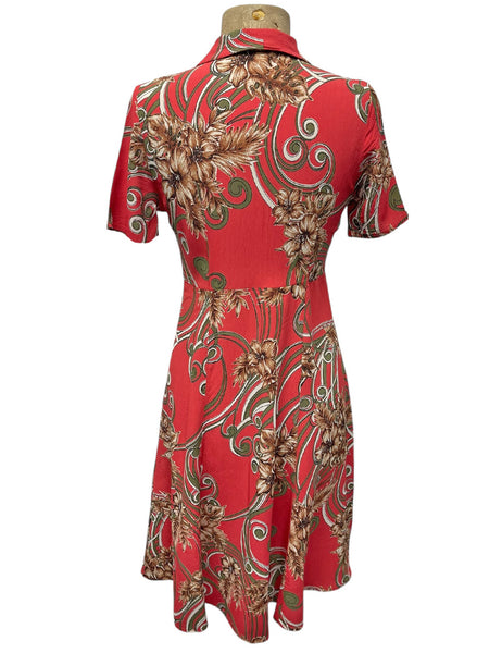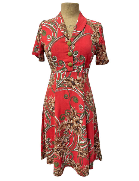 Meet one of our fan favorite Loco Lindo staples, the Vintage Day Dress! This dress is a short sleeved style inspired by the 1940s. It's a knee length skirt with a high waist, shawl collar and three beautiful matching covered buttons. This is a pullover style that you can throw on with ease! The breathable rayon crepe fabric makes it cool and comfortable for any weather!