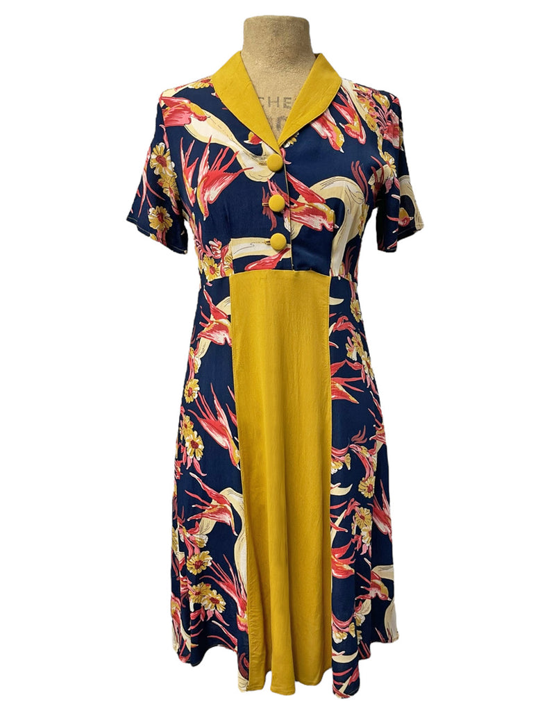 Meet one of our fan favorite Loco Lindo staples, the Vintage Day Dress! This dress is a short sleeved style inspired by the 1940s. It's a knee length skirt with a high waist, shawl collar and three beautiful matching covered buttons. This is a pullover style that you can throw on with ease! The breathable rayon crepe fabric makes it cool and comfortable for any weather!